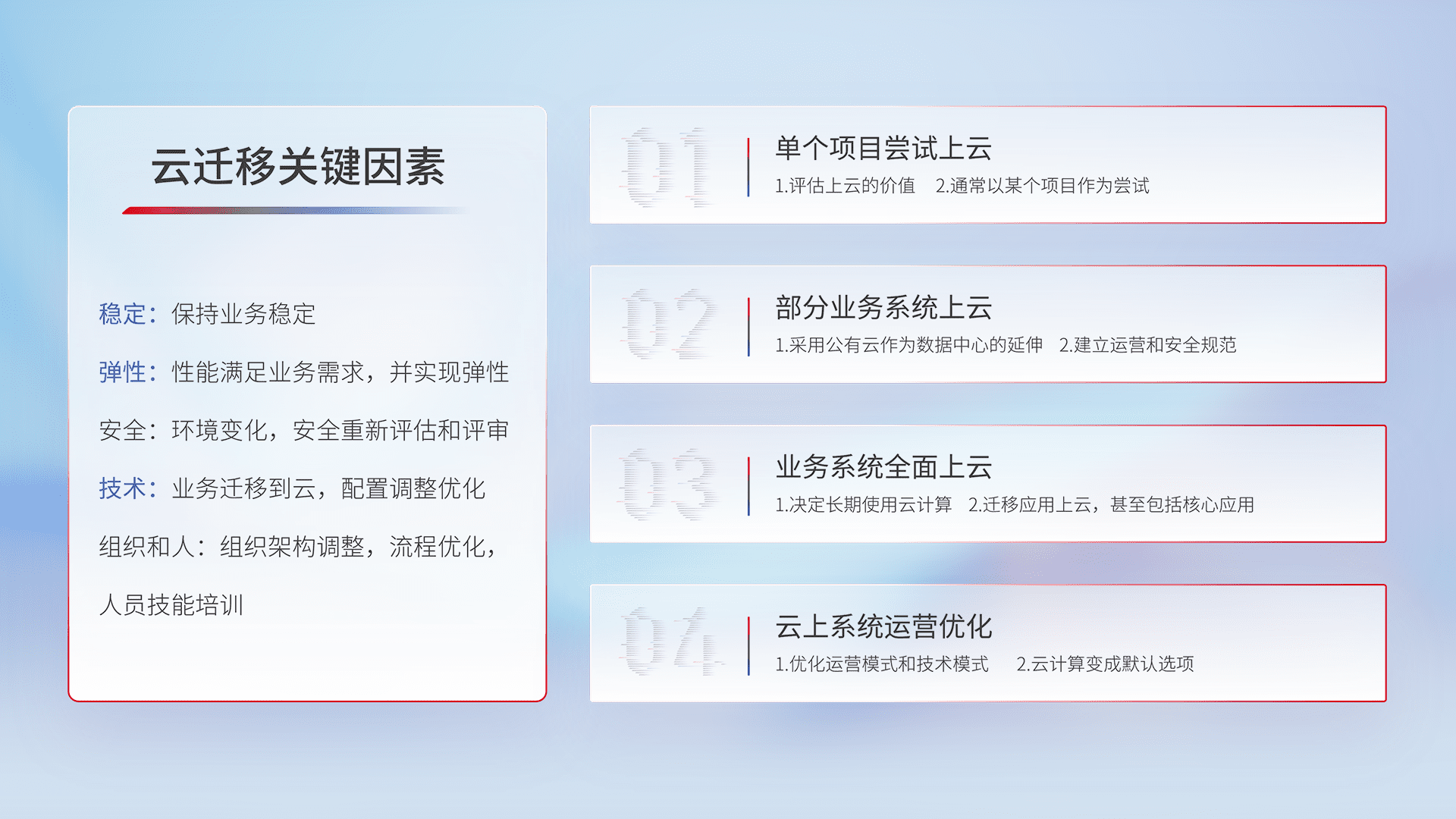 结合实际业务,,,从规划设计、、云平台选型、、、、云原生改造、、、、数据迁移、、集成交付,,迁移全过程为客户识别最佳上云路径,,,,做好风险识别管理,,,,设计网络架构、、、身份权限、、、、安全审计合规、、、操作审计、、、日志审计、、、监控告警策略、、、、多站点容灾设计等,,,对云上基础设施进行整体规划,,,,提升IT治理水平,,,以满足弹性、、、高可用、、、高性能的需求。。